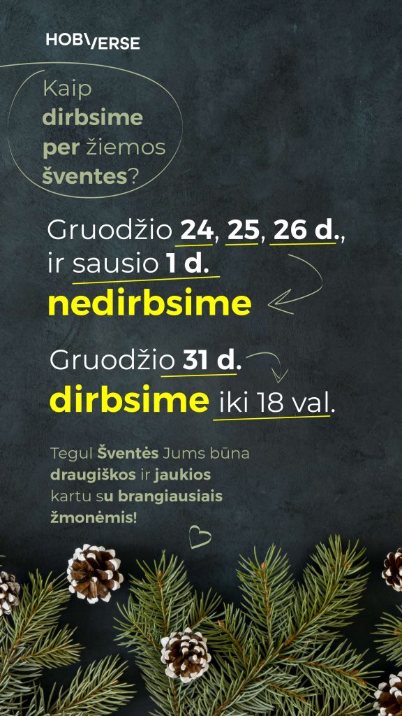 Per žiemos šventes – gruodžio 24, 25, 26 dienomis (nuo antradienio iki ketvirtadienio) ir sausio 1 dieną (trečiadienį) – NEDIRBSIME.