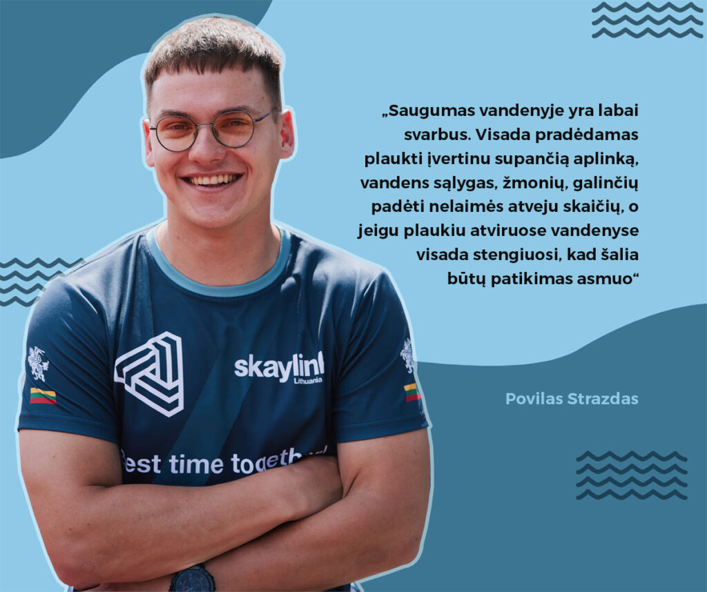 Saugumas vandenyje yra labai svarbus. Visada pradėdamas plaukti įvertinu supančią aplinką, vandens sąlygas, žmonių, galinčių padėti nelaimės atveju skaičių, o jeigu plaukiu atviruose vandenyse visada stengiuosi, kad šalia būtų patikimas asmuo.